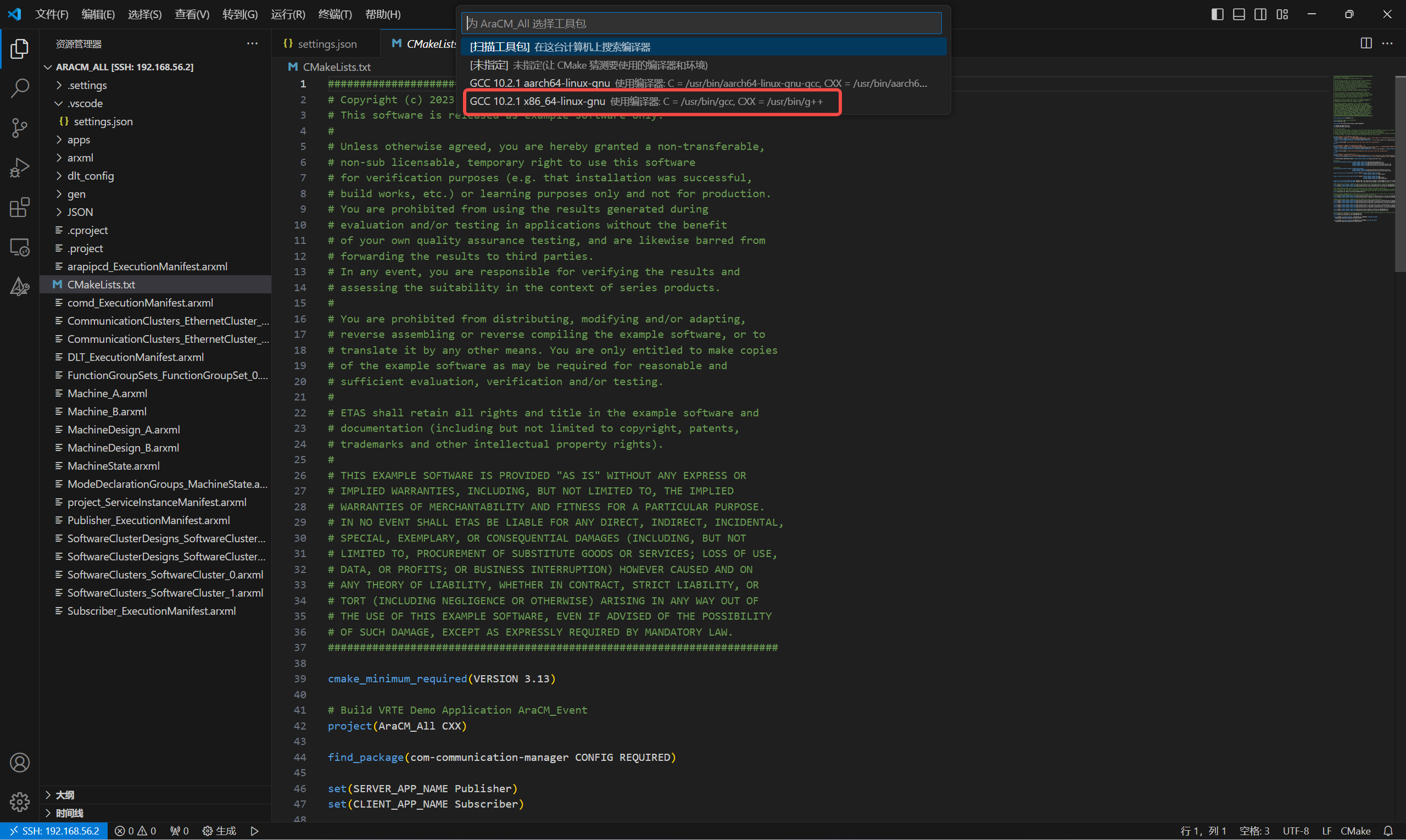 不建议使用vscode的cmake插件编译工程,推荐使用etas的rvbuild。因为etas的编译其实并不是使用的虚拟机默认的gcc工具链,而是使用了一个x86_64的交叉编译工具链。x86_64的交叉编译工具链路径如下:/opt/etas/vrte/linux-toolchain/sysroots/x86_64-etassdk-linux/usr/bin/x86_64-etas-linux