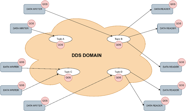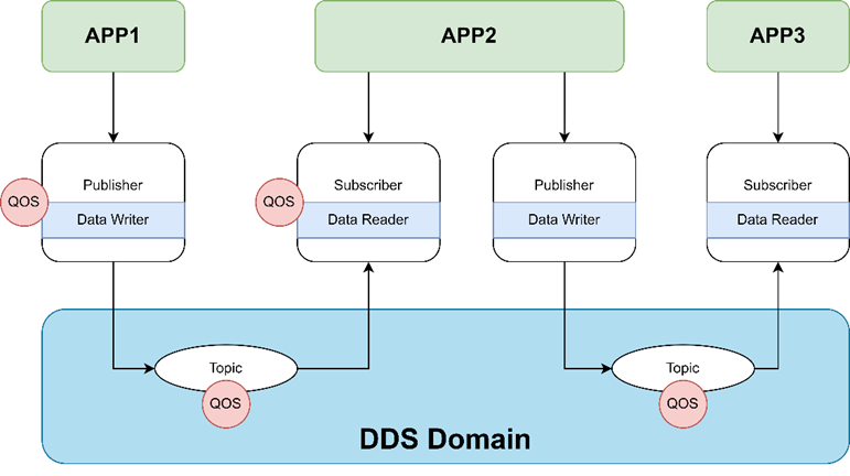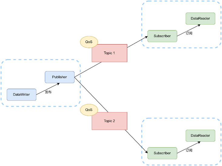 DDS 使用发布-订阅通信模式来创建去中心化、架构独立、可扩展的异步网络。DDS的标准框架中,系统之间可以通过对一个Topic的发布和订阅进行通信。在Topic上可以指定QoS以保证服务质量。