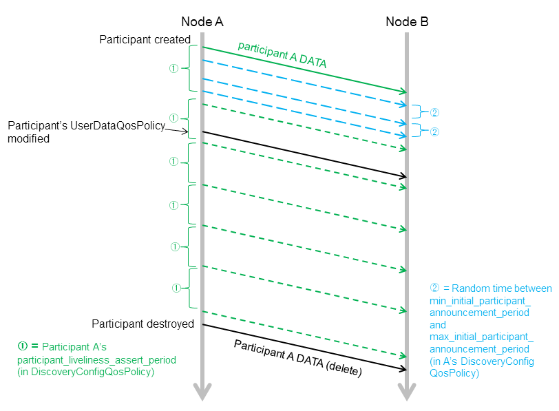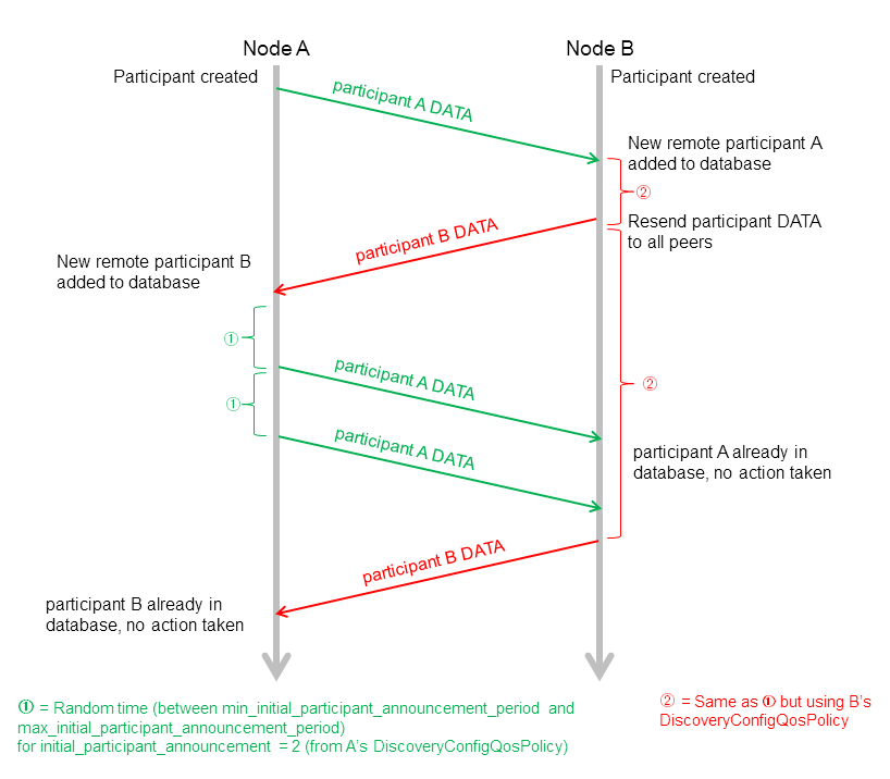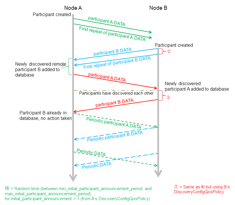 除了周期性的particitant DATAs外,蓝色长虚线的“initial repeat messages”从A发送到B。这些消息在min_initial_participant_announcement_period和max_initial_participant_announcement_period之间的一个随机时间发送,发送数量由initial_participant_announcements设置。