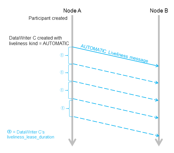 当域参与者中有任何DataWriters的Liveliness QosPolicy被设置为AUTOMATIC,inter-participant writer将以这些DataWriters的最短lease_duration为时间间隔,周期可靠的广播AUTOMATIC liveliness消息。如下图中所示: