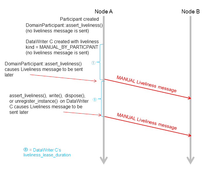 当域参与者中有任何DataWriters的Liveliness QosPolicy被设置为MANUAL_BY_PARTICIPANT,Connext DDS将会定期检查它们是否调用了write()、assert_liveliness()、dispose() or unregister()。这个检查的速率是每X秒,X是所有域参与者中MANUAL_BY_PARTICIPANT DataWriters的最短lease_duration。如果其中任何DataWriters调用了这些操作,inter-participant writer将会可靠广播一个MANUAL liveliness消息。