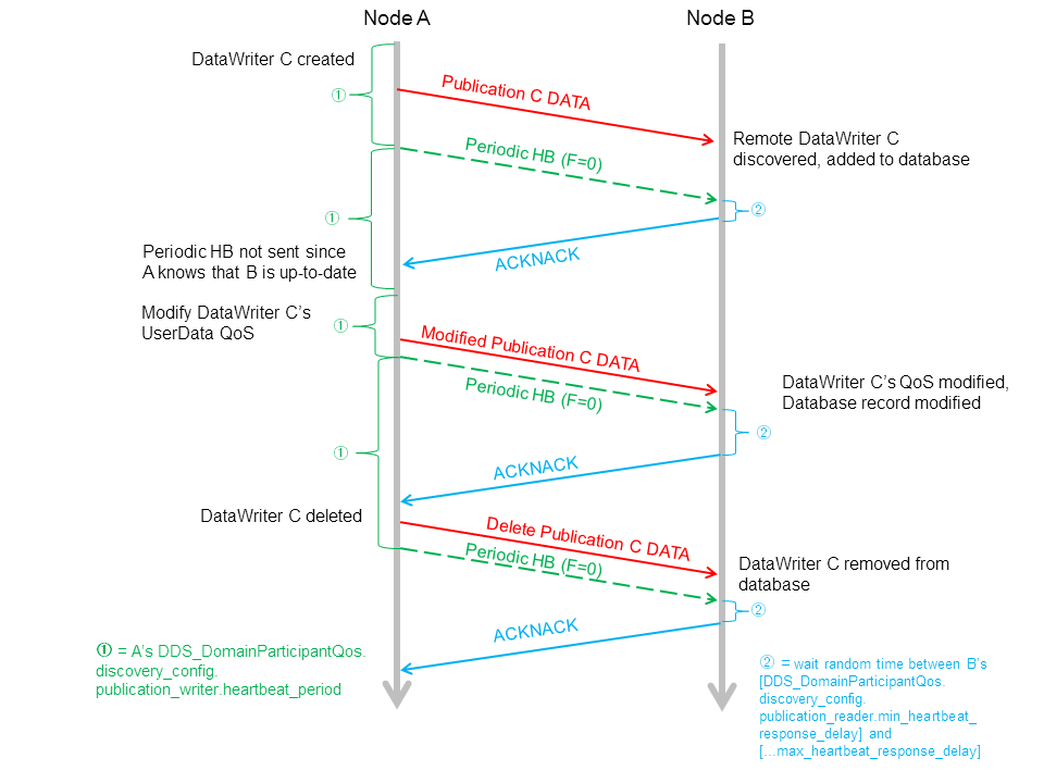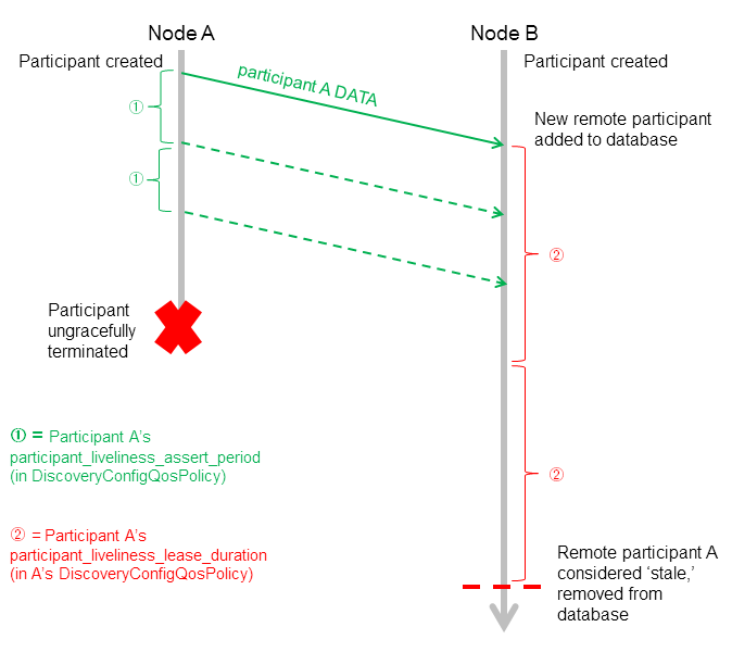 上图中,绿色短虚线是周期性的particitant DATAs。这些消息之间的时间间隔由DiscoveryConfig QoSPolicy中的participant_liveliness_assert_period控制。