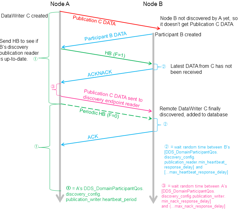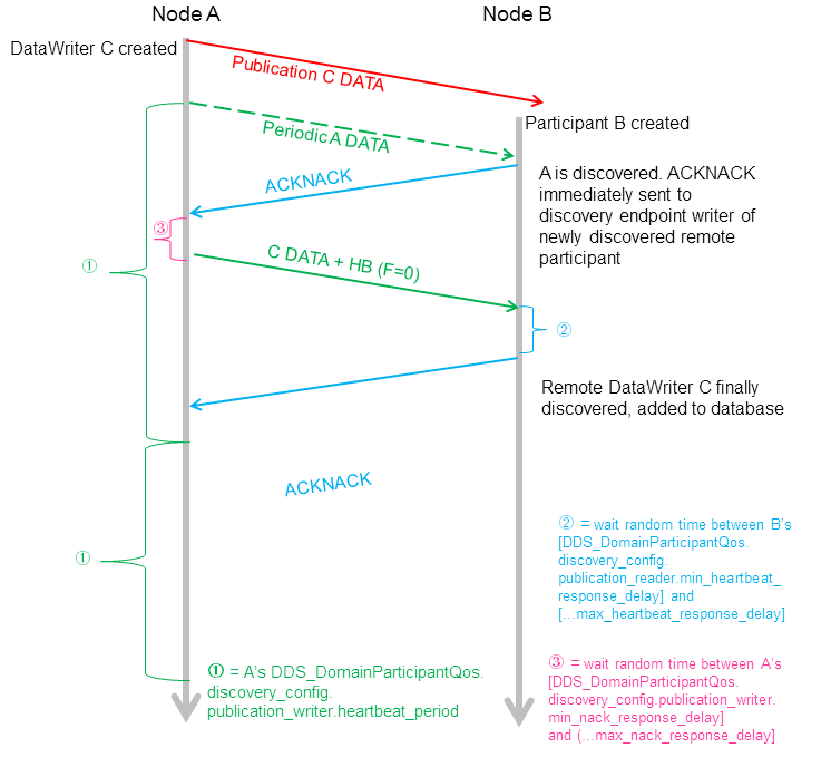 下图中,通过HB来触发后加入者发现DataWriter。参与者A的writer C在发现参与者B之前被创建。对于A,响应接收到participant B DATA消息,participant A DATA消息被发送给B。在A上的端点发现reader也会发送ACK/NACK给B上的端点发现writer。