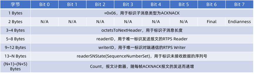 该子消息只能包含否定确认。注意这不同于ACKNACK子消息,ACKNACK子消息包括肯定和否定确认。