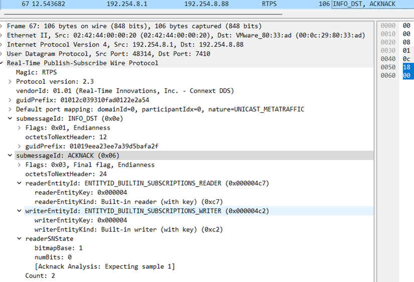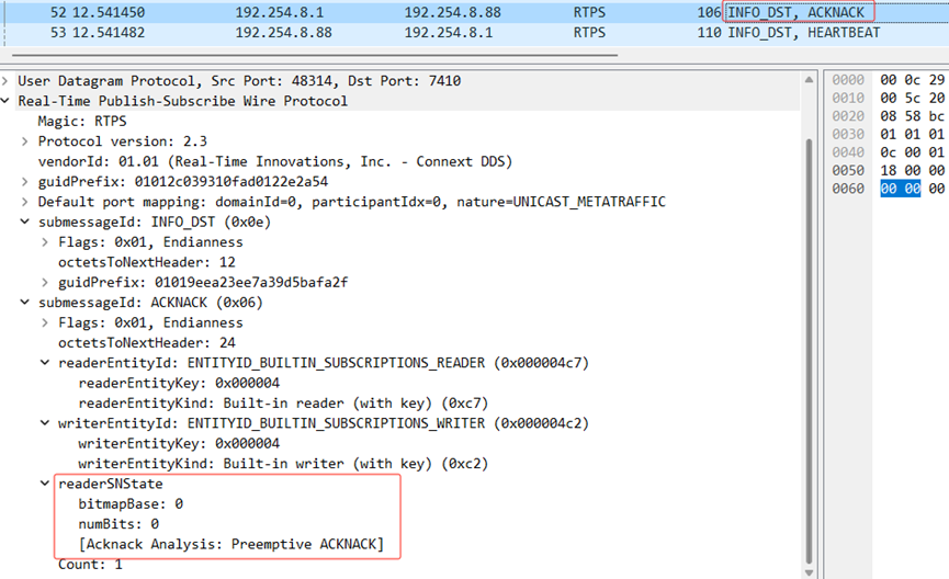 下图中的ACKNACK.readerSNState的bitmapBase和numBits都为0,可以理解为是一条初始化ACKNACK消息。该消息通常在StatefulReader匹配一个StatefulWriter的时候被发送。当StatefulWriter收到该消息时,响应一条HEARTBEAT消息。