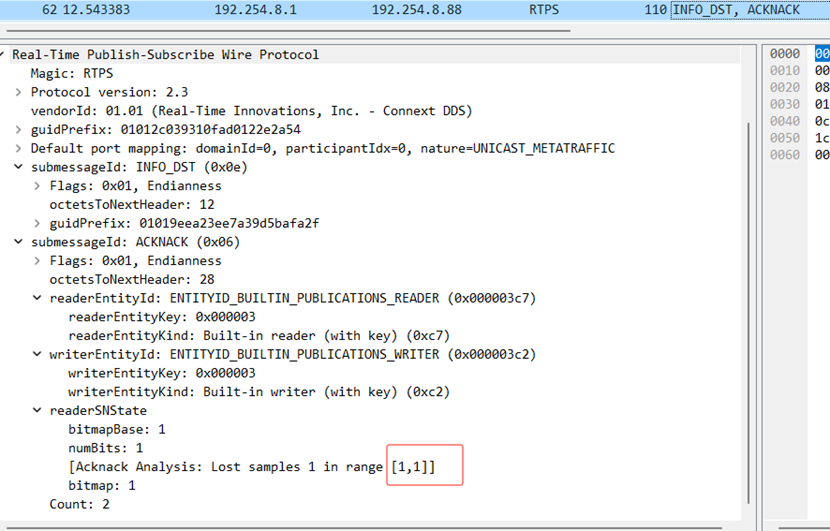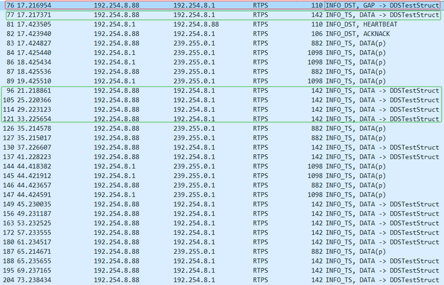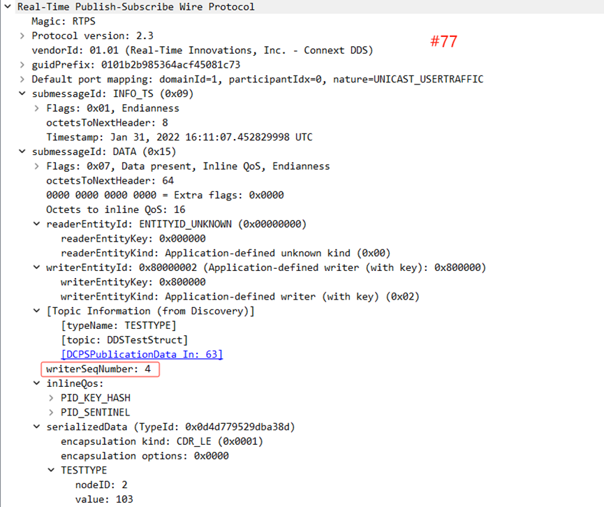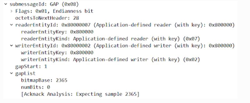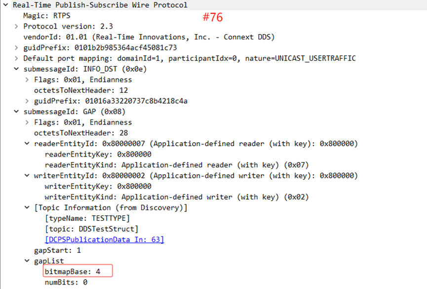 其中,第76条中gapList.bitmapBase的值4,与Subscribe接下来从Publisher接收到的第一条报文中的writerseqNumber的值4相对应,表示在此之前Publisher发送的三条消息并未收到。