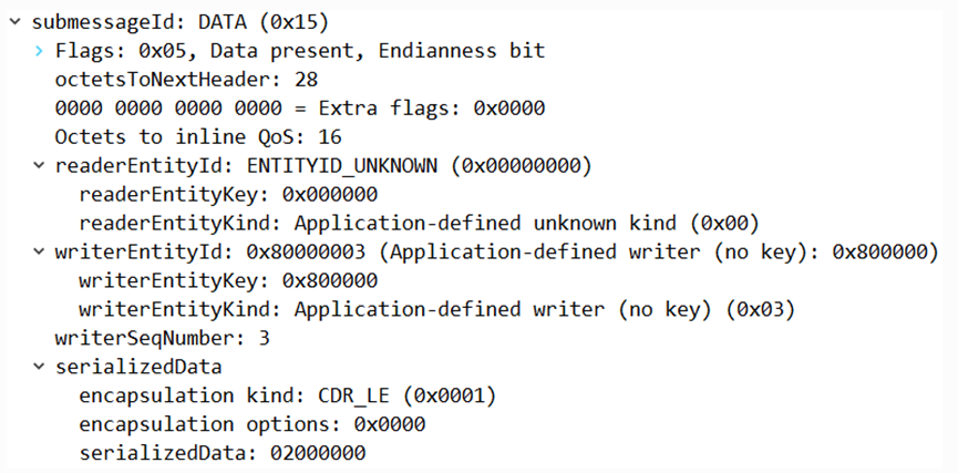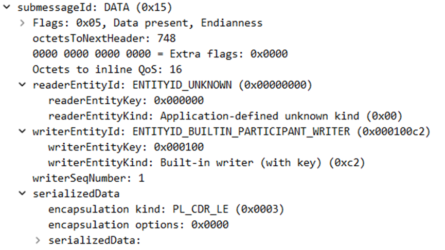 如果Wireshark知道DataWriter GUID,则意味着这是元流量。例如,上面的DataWriter GUID是未知的(它是应用程序定义的编写器),但下面的DataWriter GUID是已知的(BUILTIN_PUBLICATIONS_WRITER,DataWriter的发现流量)。
