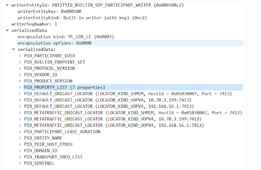 当DATA子消息包含元流量时,Wireshark会正确解析该信息。在这种情况下,有一个来自发现过程的参与者公告(writerEntityId为BUILTIN_SDP_PARTICIPANT_WRITER,其中SDP代表Simple Discovery Protocol)