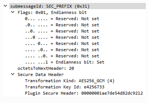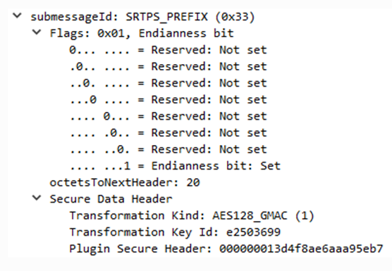 SRTPS_PREFIX子消息提供了一种为RTPS子消息列表添加前缀的方法,这样它们就可以受到保护。SRTPS _PREFIX之后应是RTPS子消息列表,这些子消息之后应是SRTPS _POSTFIX子消息。