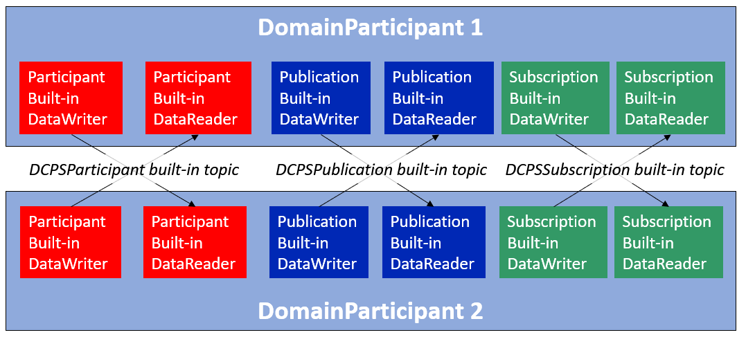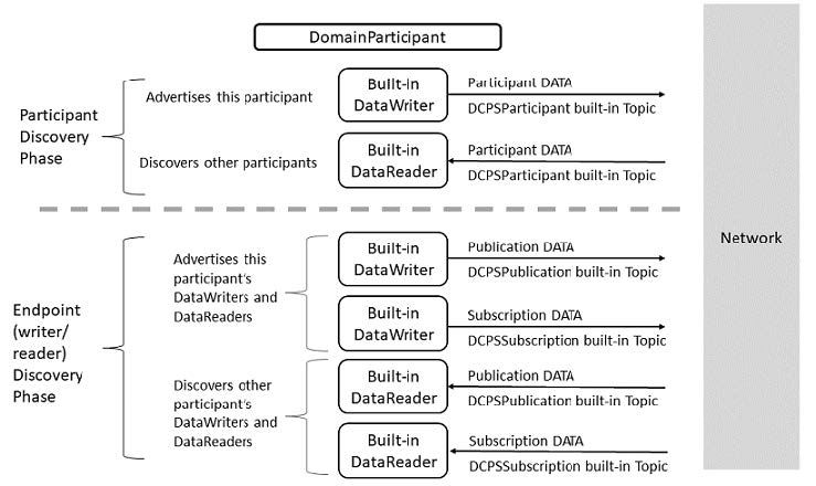 发现是使用内置的DataWriters和DataReaders来实现的。也就是说,它们也是DDSDataWriter/DDSDataReader。对于每个DomainParticipant,自动创建三个内置的DataWriters和DataReaders来用于发现目的。