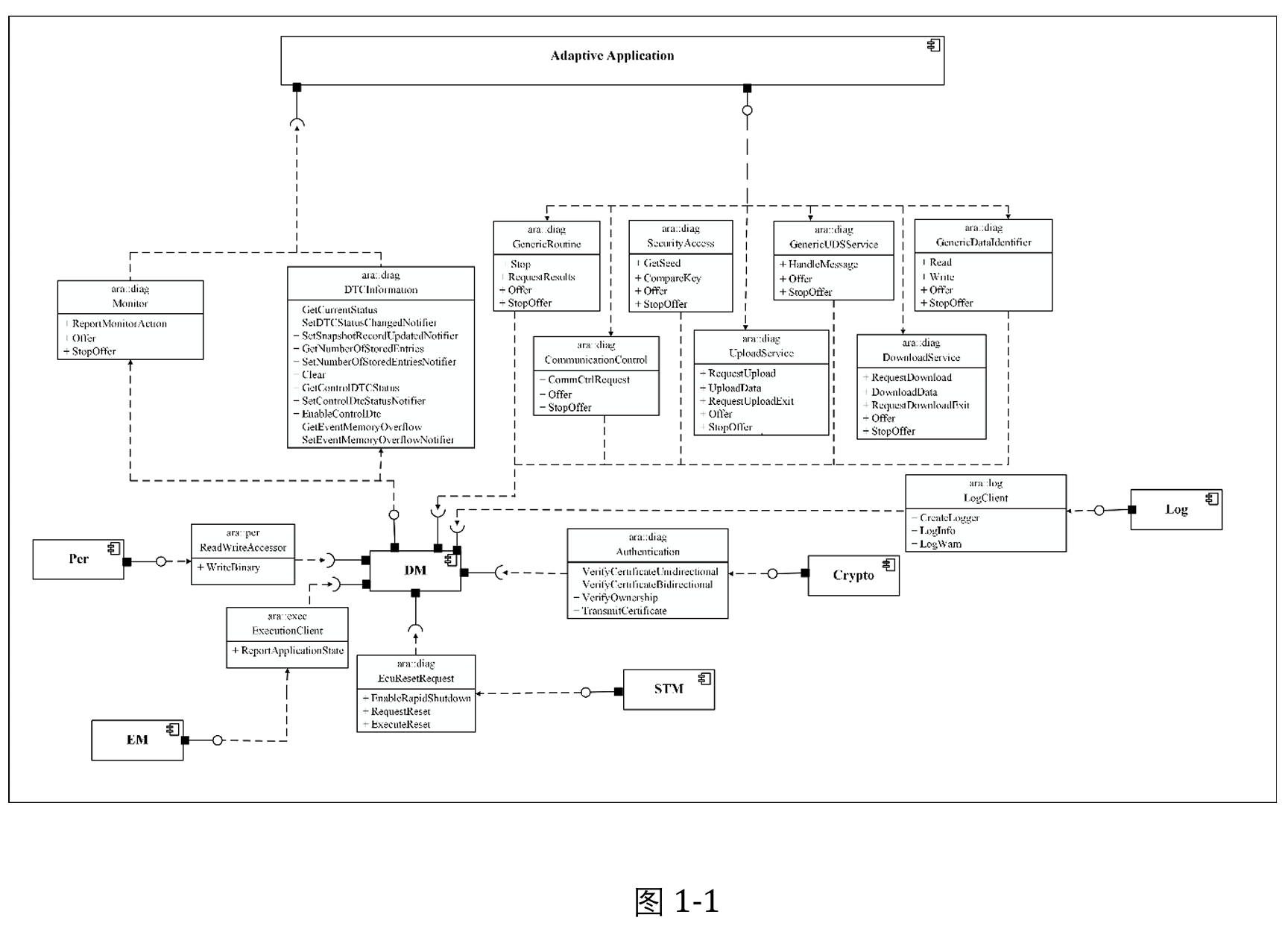| Diag App(asw) | DM 作为proxy 方,通过ara::com(IPC SHM)将具体服务请 求发送至Diag App,Diag App 完成具体UDS 服务实现。 |