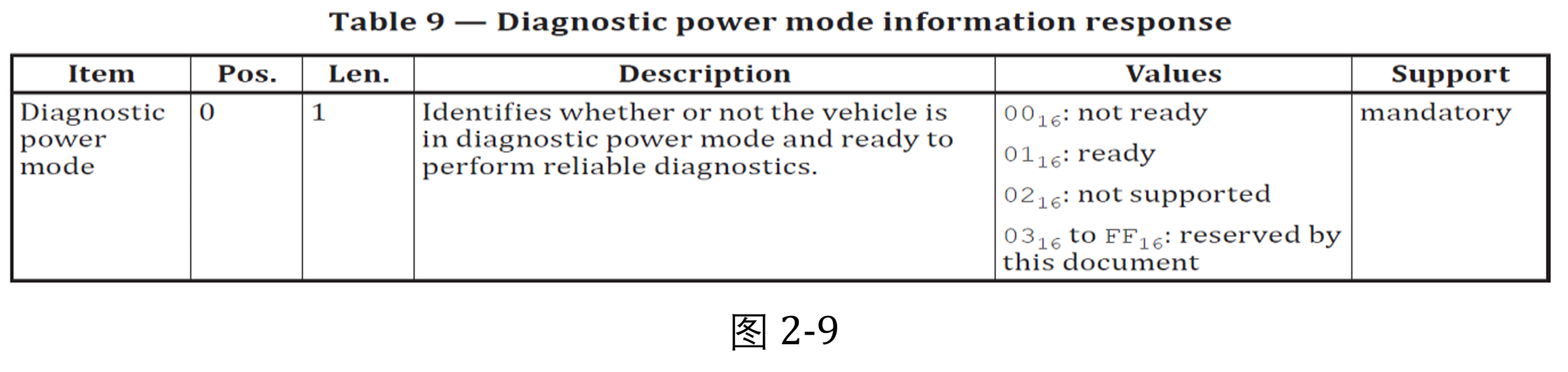 该报文是上一个报文的响应报文,DoIP节点用该响应报文来向诊断设备发送 电源模式信息,来告知诊断设备当前节点是否允许进行诊断。报文的数据段定义 如下: