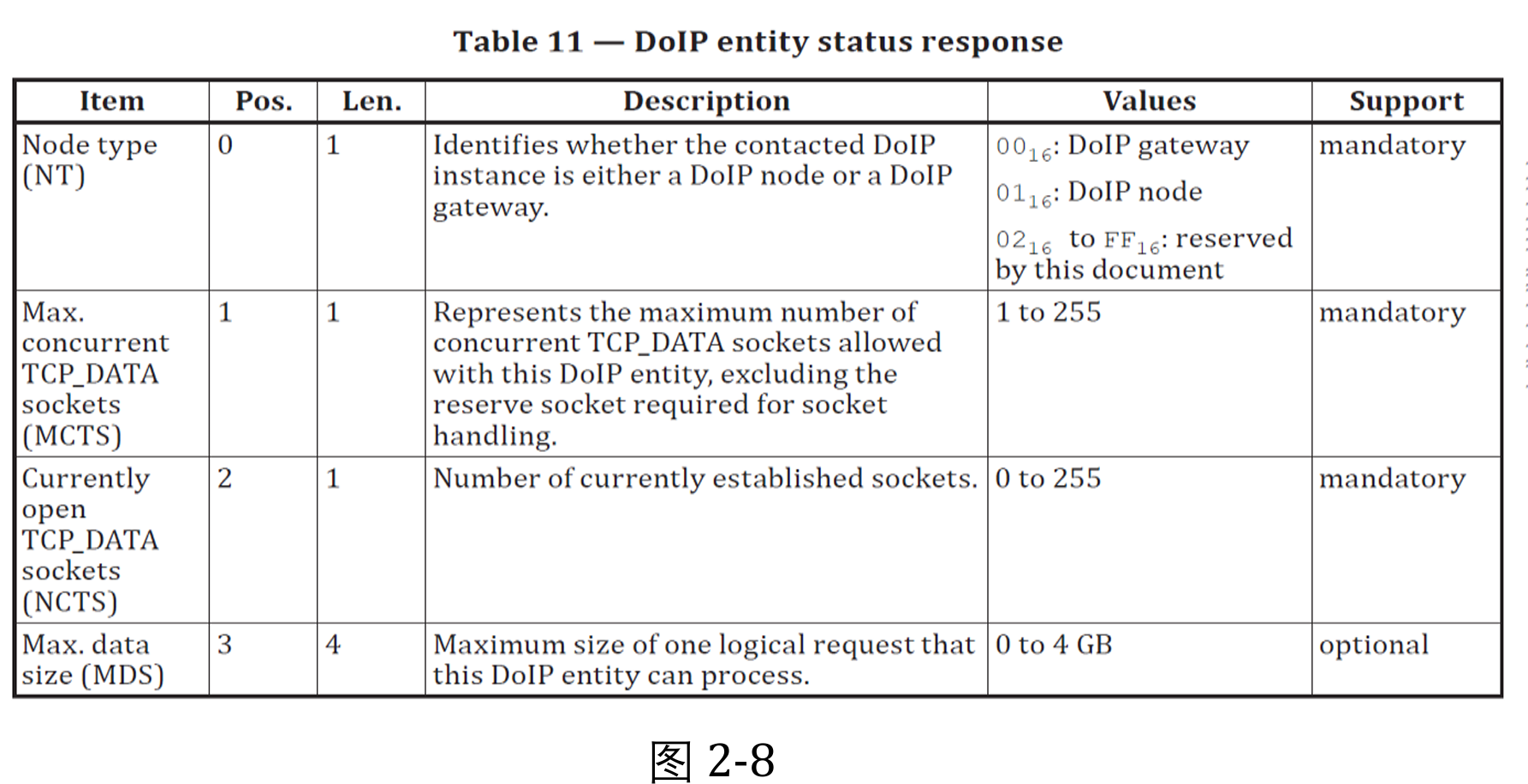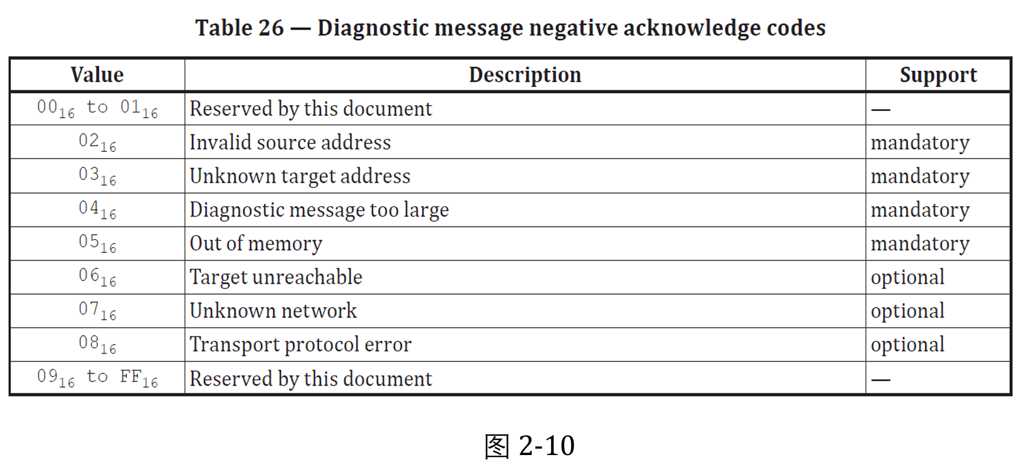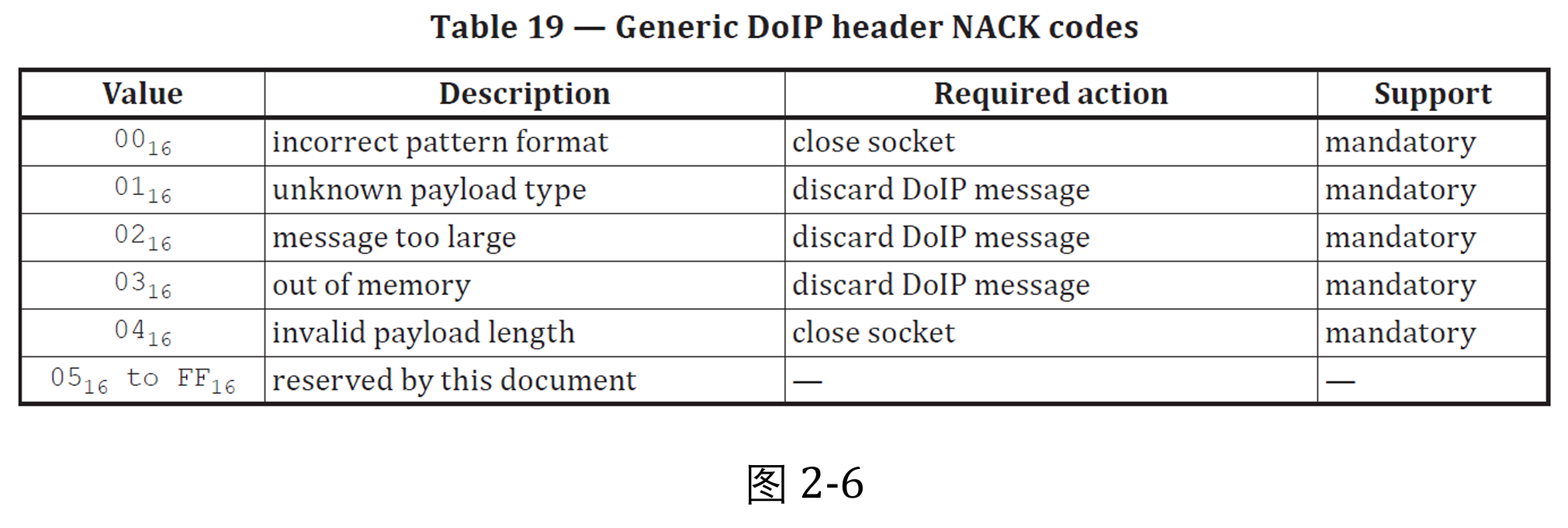 其中Required action 为 DoIP 节点在发送完否定响应报文后采取的动作,上图2-6 包括关闭套接字和忽视报文。