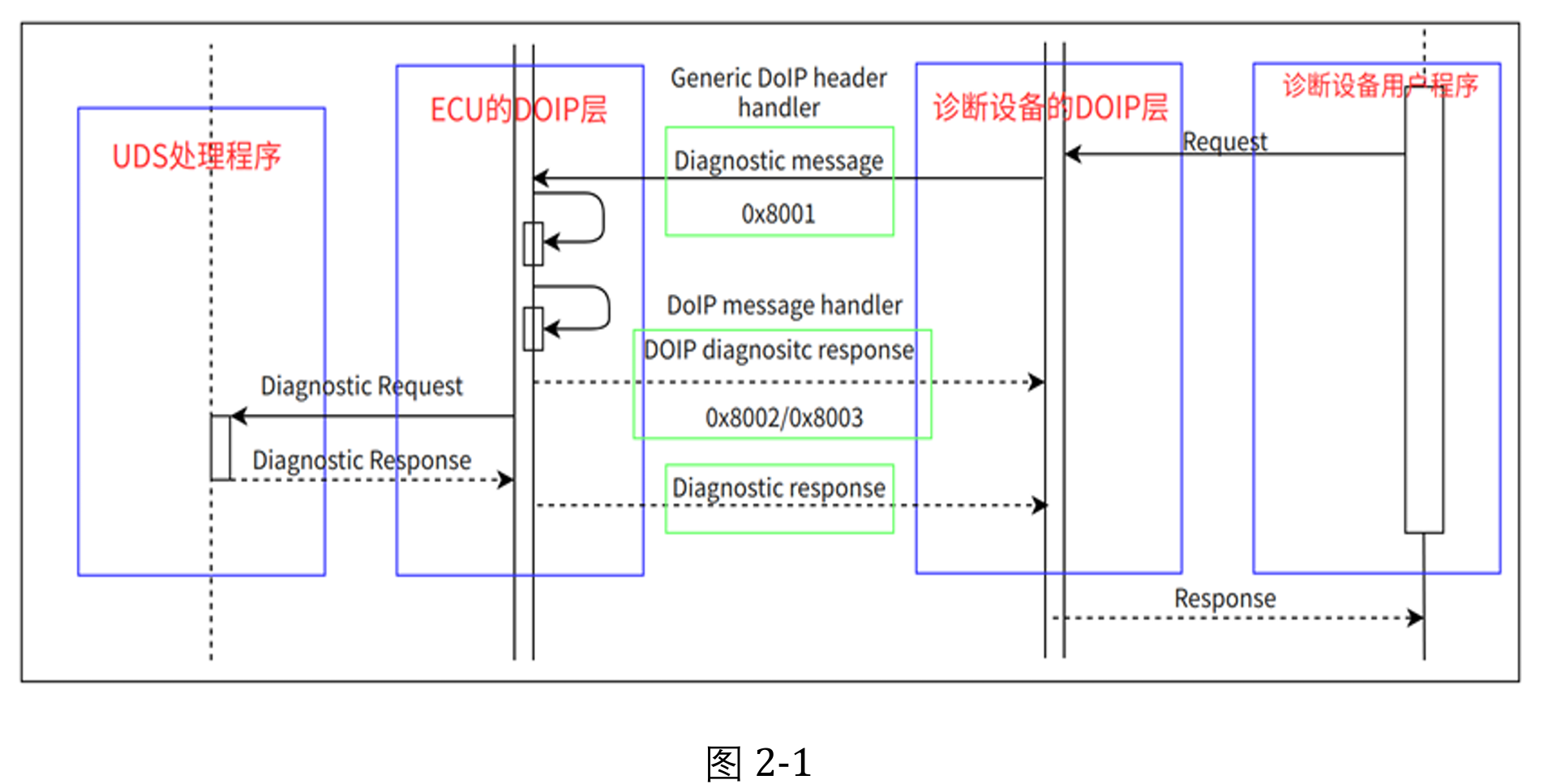 如下图 2-1所示,显示了在诊断工具和车辆的电子控制单元(ECU)之间基于 DoIP(Diagnostic over Internet Protocol)协议进行通信时的数据传输过程。