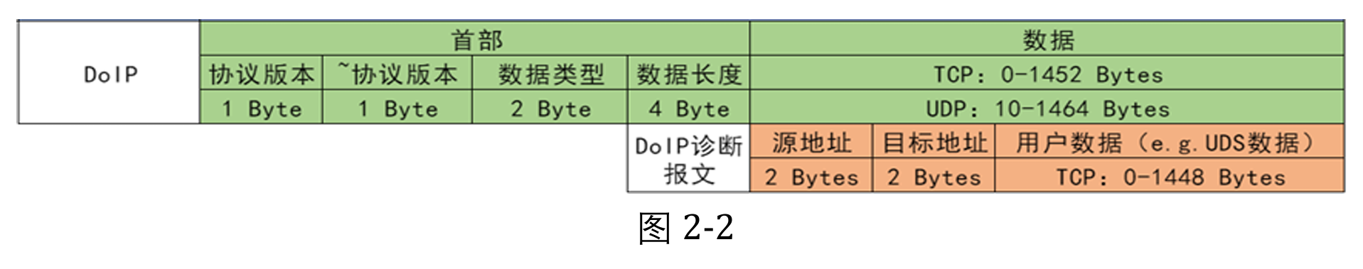 诊断设备用户程序将请求的uds报文传输至诊断设备的DOIP层,DOIP层会将 uds 报文进行打包,封装doip header(具体格式参考图2-2 所示),进而传输至ECU 端。ECU 的DOIP 层接收到报文,会先进行doip header 处理,处理完成后将uds报文传输至ecu的uds处理程序。处理完成后数据流上述相反,再回复至诊断设备,从而完成一次完整交互。