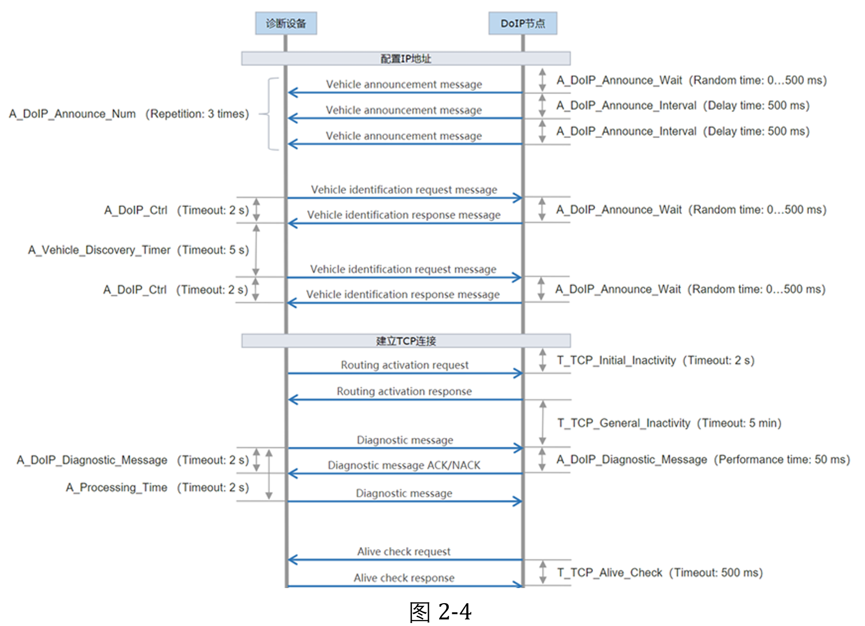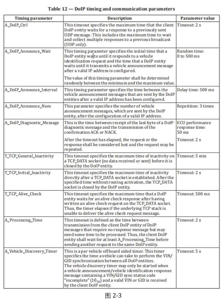在 DoIP 协议中,时间参数的设置非常重要,因为它直接影响通信的稳定性和效率。下图2-3定义了doip时间参数。