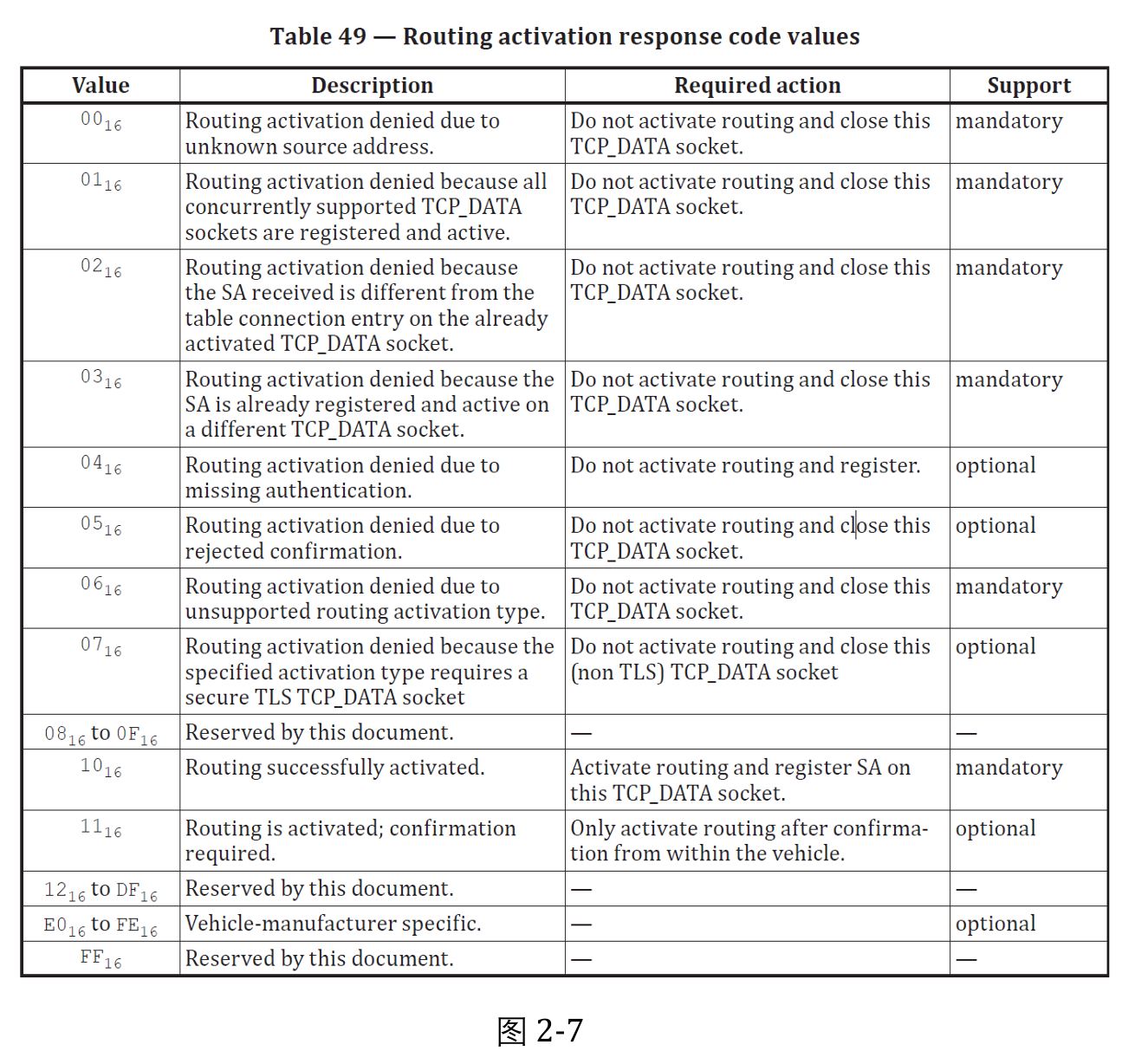 DoIP 节点收到诊断设备的路由激活请求报文后,建立TCP连接,并返回该路由激活响应报文。路由激活响应码如下图2-7所示: