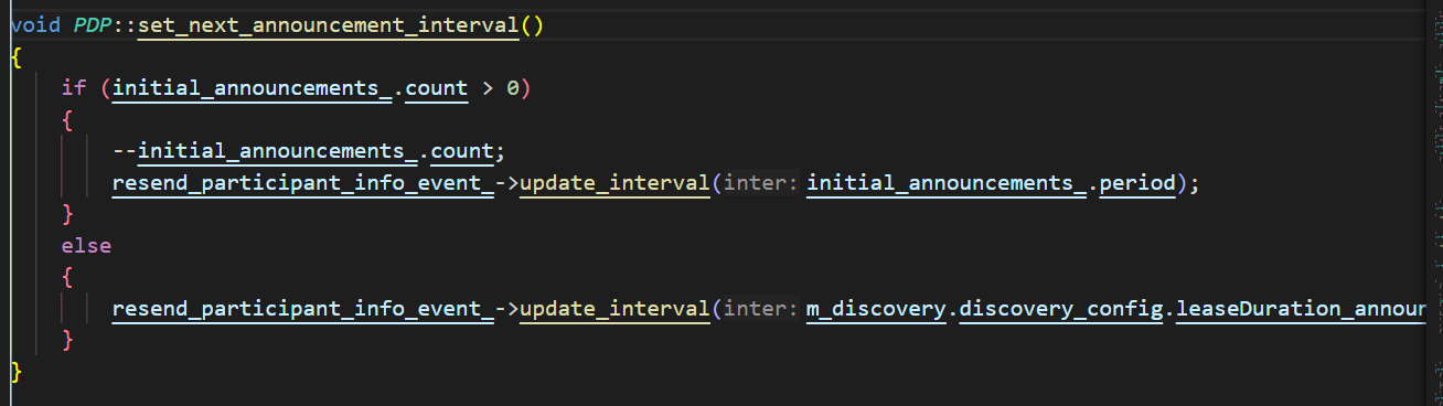 这里调用set_initial_announcement_interval时会掉用以下函数,这里面count的初始值是5 period是100ms 也就是说pdp的前五次公告数据会很频繁,然就会变为leaseDuration_announcementperiod设置的时间默认为3秒
