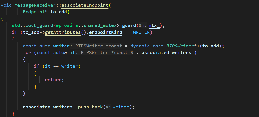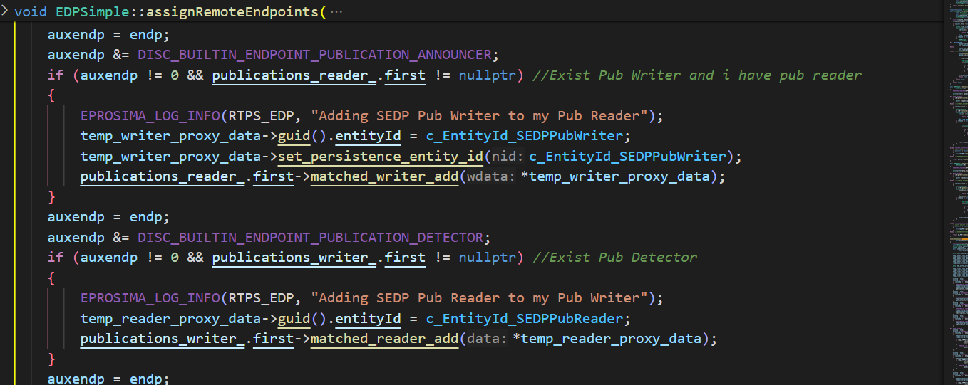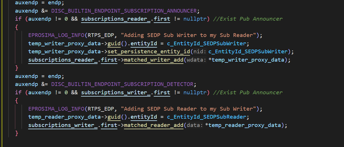 注意在代码中一般会看到 reader->matched_writer_add(writer_data)或者 writer->matched_reader_add(reader_data) 因为端点匹配本来就是read和write配对的