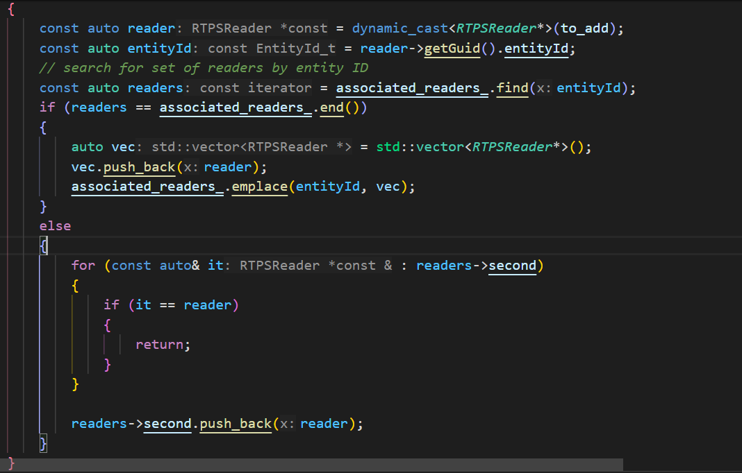 RTPSParticipantImpl::enableReader,这里会将端点分配给接受资源assignEndpoint2LocatorList中继续调用 MessageReceiver::associateEndpoint函数,会将PDP对象的EntityID添加到接收消息的readers中: