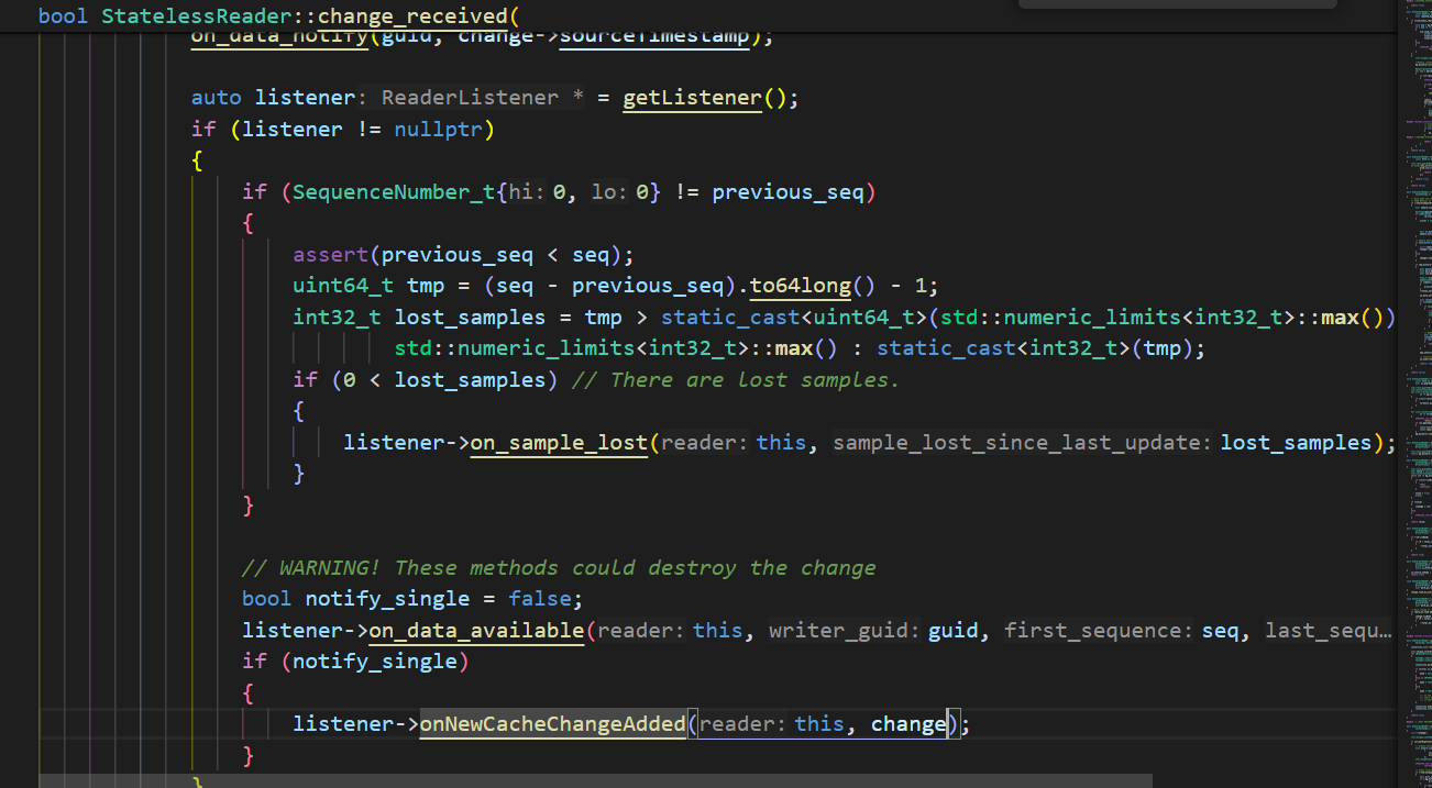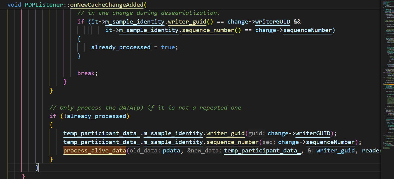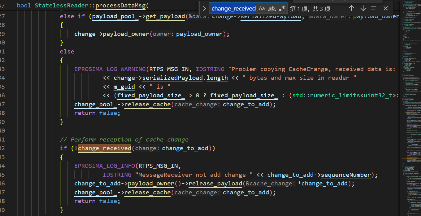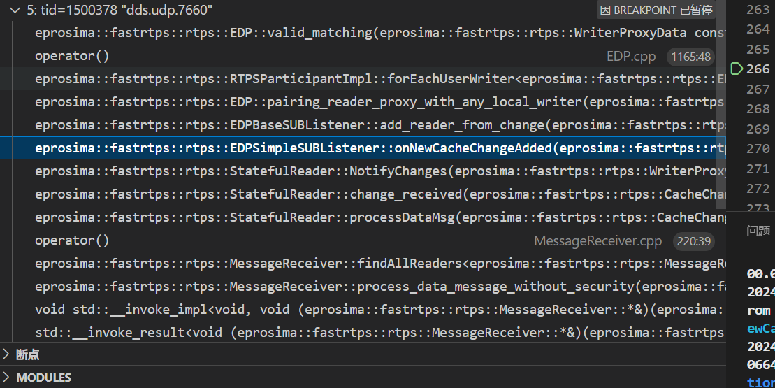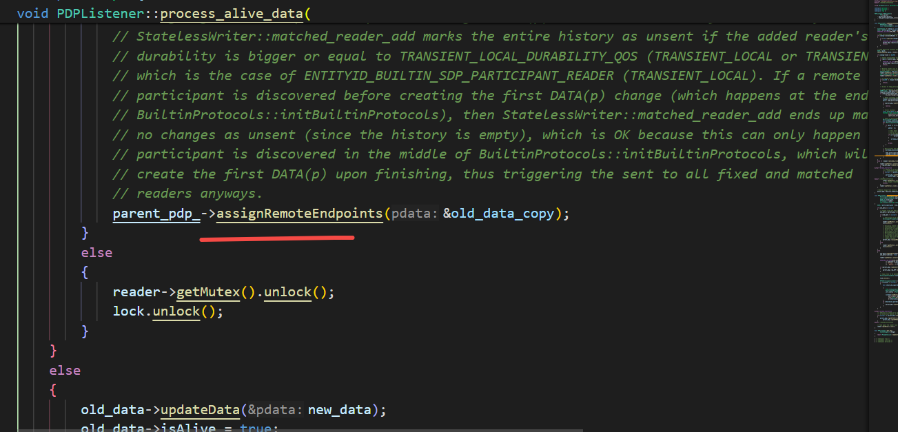 这里关注一个函数 proc_Submsg_Data 这是子消息DATA的解析函数,会调用到findAllReaders,然后callback会调用StatelessReader::processDataMsg函数,调用到PDP的监听器PDPListener的onNewCacheChangeAdded函数,接着调用到PDPSimple的assignRemoteEndpoints函数