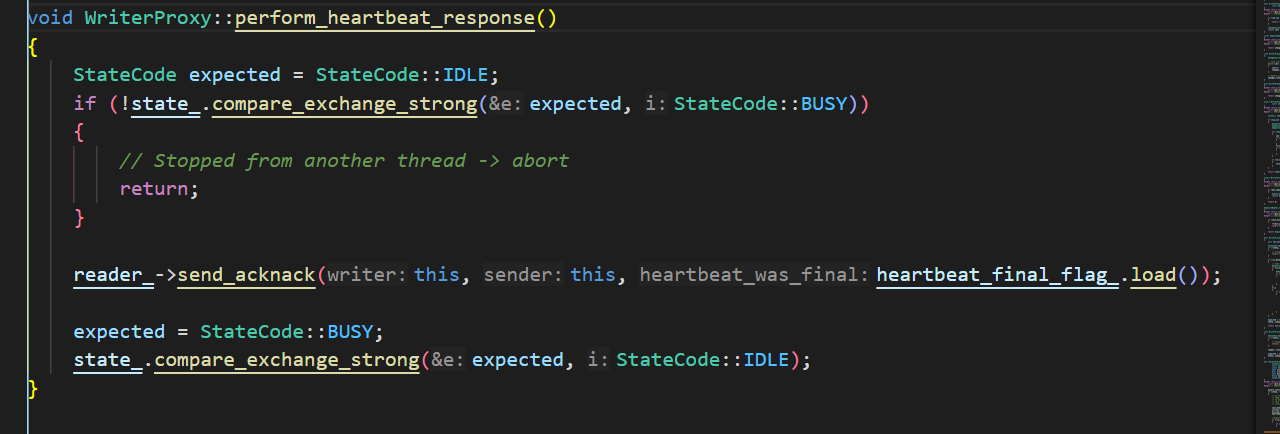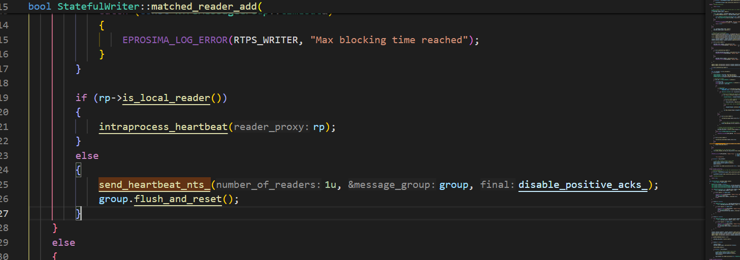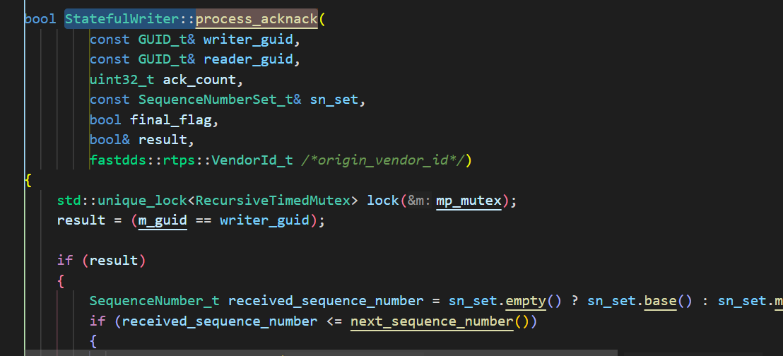 所以这里对应的StatefulReader::processHeartbeatMsg就会收到一个HEARTBEAT消息,最终会执行到WriterProxy::process_heartbeat 在这里会根据报文判断是否需要响应ACK