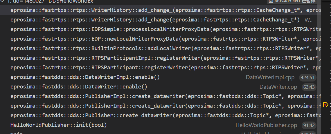 UserWriter在被创建时,它的属性信息被封装成数据,存放在发布端EDP的SEDPPubWriter的历史缓存中。UserWriter被创建时调用堆栈如下:
