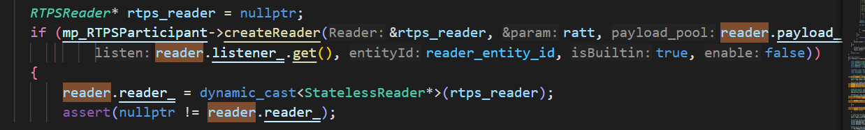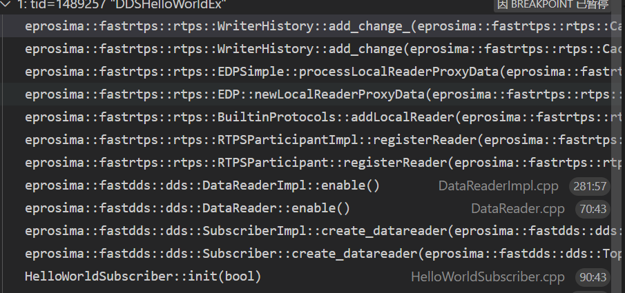 UserReader在被创建时,它的属性信息也被封装成数据,存放在订阅端EDP的SEDPSubWriter的历史缓存中。UserReader被创建时调用堆栈如下: