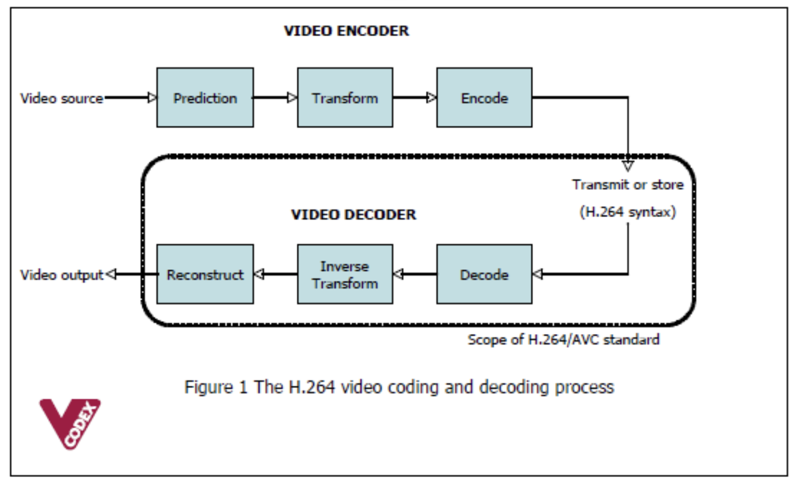 《H.264 建议书:高级视频编码》是由国际标准组织 ITU-T(国际电信联盟)和 ISO/IEC(国际标准化组织/国际电工委员会)发布的文件。它定义了一种压缩视频的格式(语法),以及解码这种语法并生成可显示视频序列的方法。标准文档并没有规定如何对数字视频进行编码(压缩)——这一点由视频编码器制造商自行决定——但在实际中,编码器的步骤通常会与解码过程相对应。图 1 展示了编码与解码的流程,并标注了 H.264 标准所涵盖的部分。