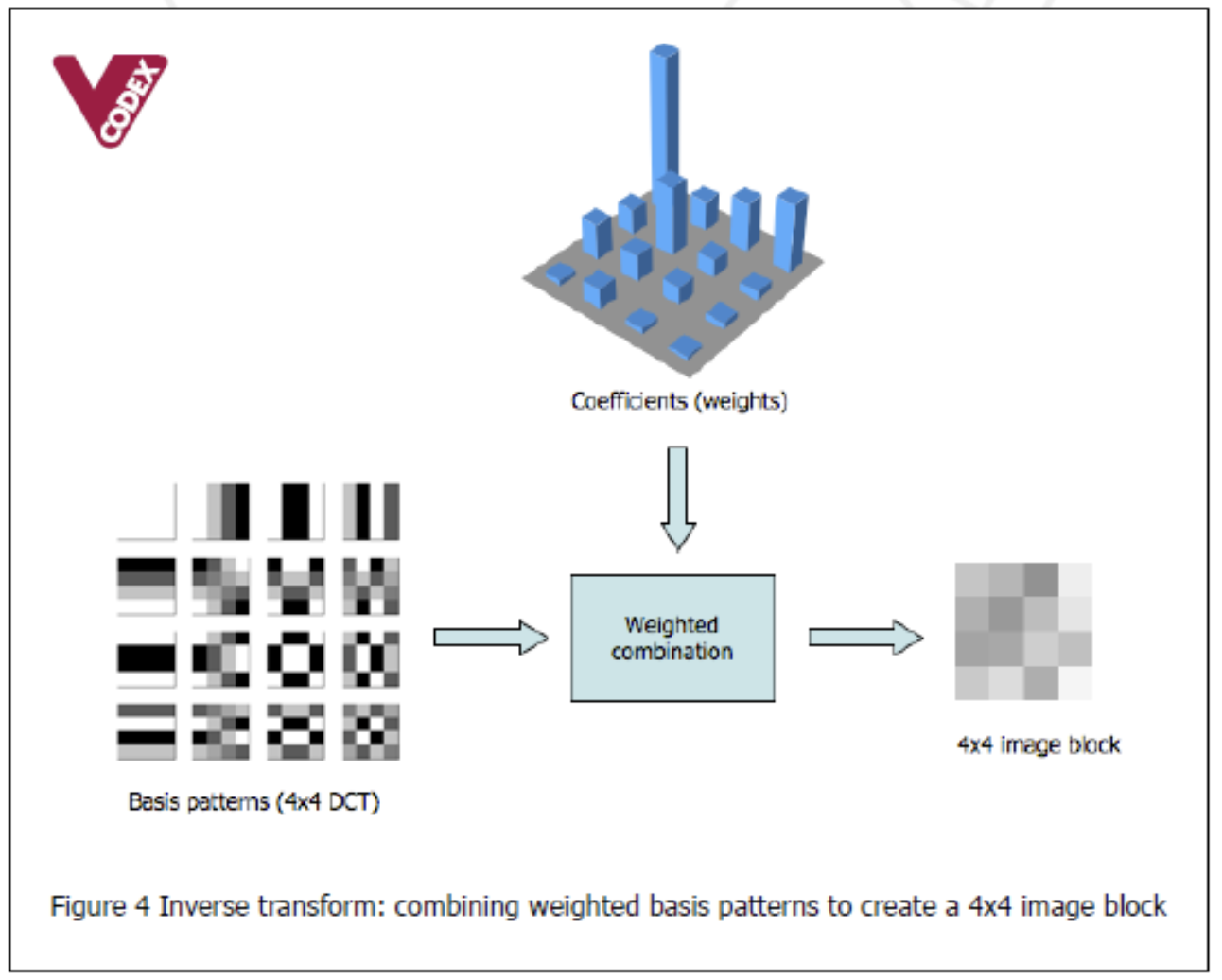 一个残差样本块会使用 4x4 或 8x8 的整数变换进行处理,这是一种离散余弦变换(DCT)的近似形式。该变换输出一组系数,每个系数对应一个标准基模式的权重值。当这些加权的基模式组合在一起时,就能重新生成该残差块。图 4 展示了逆 DCT 如何通过给每个基模式赋予相应系数权重并加以组合,从而生成一个图像块。