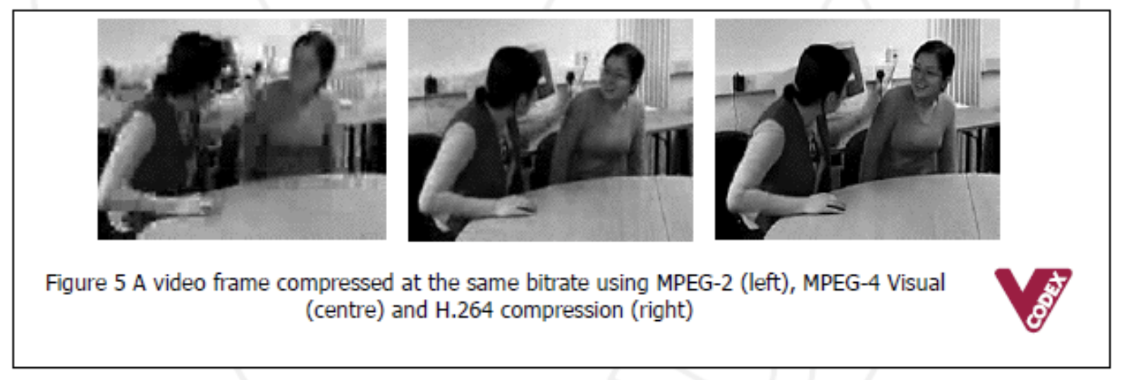 换句话说,在相同码率下,H.264 相比 MPEG-2 和 MPEG-4 Visual 可以提供更好的视频质量(见图 5)。