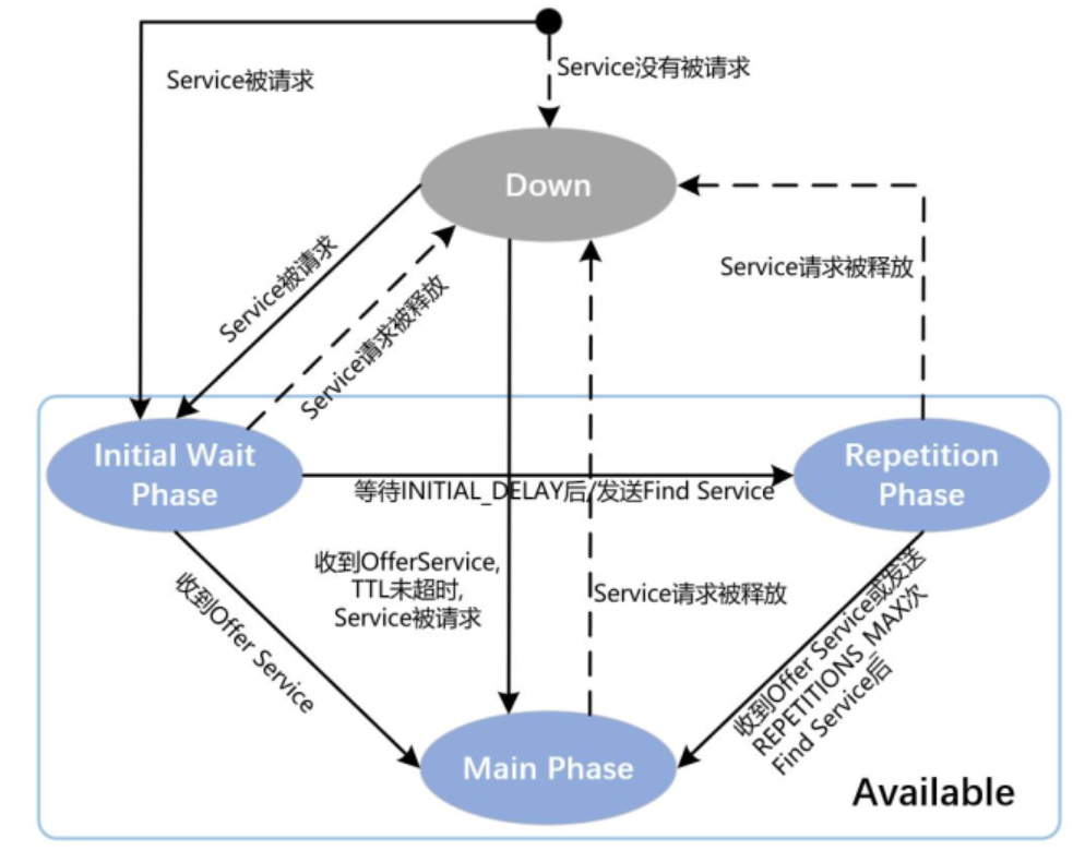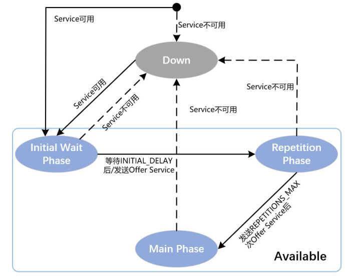 当服务准备完毕(Available)后,进入此阶段。如果此阶段收到 FindService 报文,服务端忽略此消息,不做任何处理。如果服务不可用了,将返回进入 Down Phase。此阶段需要定义时间参数 INITIAL_DELAY_Min 和 INITIAL_DELAY_Max,初始化时间取其之间的随机值,当定时器超时后,发送第一帧 OfferService 报文,标志着进入下一个阶段。