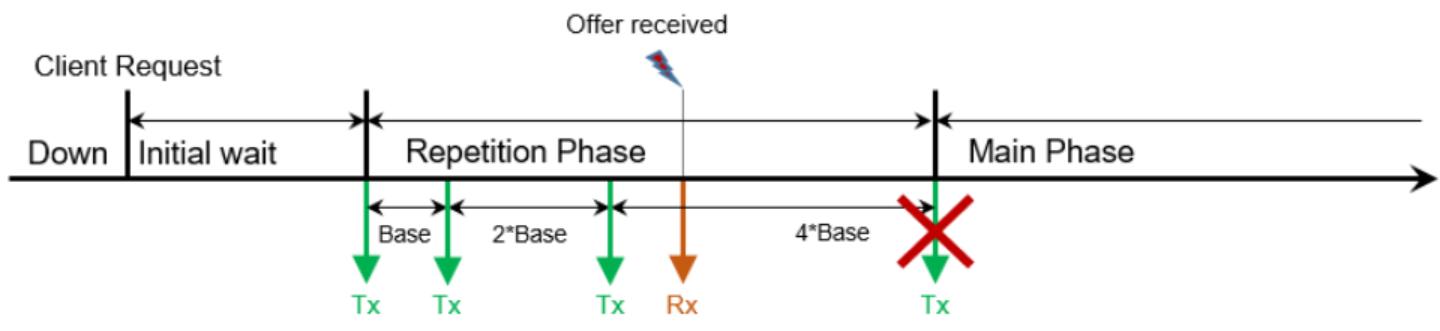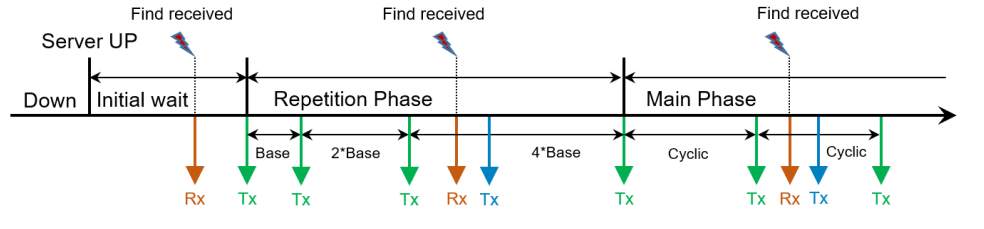 重复发送 FindService 报文,重复次数由 REPETITIONS_MAX 决定,而发送时间间隔以REPETITIONS_BASE_DELAY 为基本时间,每发送一次,间隔时间是前一个间隔时间的 2倍。